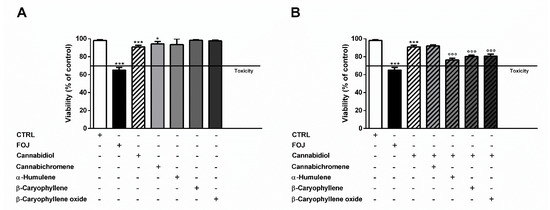 Moreover, two cocktails of the nonintoxicating phytocannabinoids and caryophyllane sesquiterpenes, namely mFOJ and mFOS respectively, containing the same concentrations determined in the FOJ and FOS extracts, were prepared. In the same experiments, suitable controls with the substances alone were tested too. At the end of the 24 h exposure, cell viability was measured by MTT assay, as previously reported.