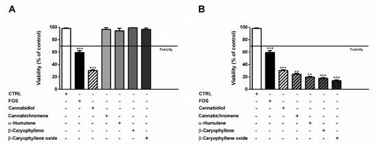 Otherwise, at the concentration of 17 μg/mL measured in FOS, cannabidiol produced a 2-times higher cytotoxic effect than the extract, despite null effects of the other compounds (Figure 3A). Combining α-humulene (0.07 μg/mL), β-caryophyllene (0.1 μg/mL), β-caryophyllene oxide (0.1 μg/mL), and 17 μg/mL cannabidiol, an increased cytotoxicity by about 1.5-, 1.7-, and 2.2-times was achieved, respectively. Furthermore, cannabichromene (6 μg/mL) produced a slight 1.2-fold increase of cannabidiol cytotoxicity (Figure 3B).
