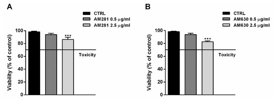 Based on literature [19] and preliminary experiments, the nontoxic concentrations of 0.5 and 2.5 µg/mL, corresponding to 1 and 5 µM, were chosen to be tested for both AM630 and AM281. According to the experimental protocol, the antagonists were administered one hour before treatment with the test samples; after a 24 h exposure, cell viability was measured by the MTT assay.