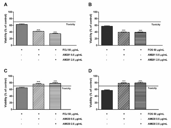 As displayed in Figure 6A,B, the cytotoxicity of FOJ and FOS was not diminished by AM281. Indeed, increasing the inhibitor concentration, a progressive 1.5- to 1.8-fold lowering in cell viability with respect to FOJ was induced; similarly, FOS cytotoxicity increased in the presence of AM281 by about 1.4- and 1.5-times. Conversely, both the AM630 concentrations significantly hindered FOJ and FOS cytotoxicity, with a reduction by about 1.2- and 1.4-times, respectively (Figure 5C,D).