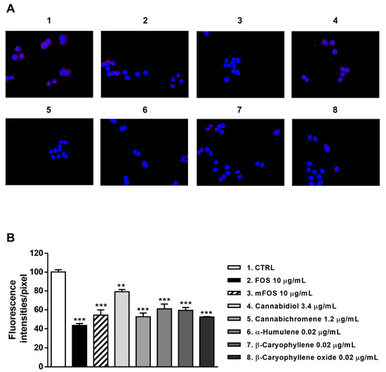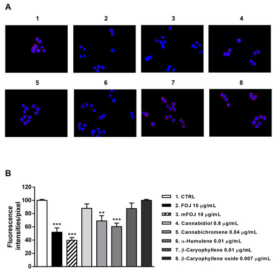 Staining of MDA-MB-468 cells with a specific antibody highlighted the presence of CB2 receptors on their surface, as shown by a red color in control cells, which appeared differently when modulated by the treatments (Figure 8A and Figure 9A). After 24 h treatment, FOJ and mFOJ were able to significantly decrease CB2 receptor expression by about 1.9- and 2.5-times, respectively, despite a lower modulation by 0.04 μg/mL cannabichromene (1.4-fold reduction) and 0.01 μg/mL α-humulene (1.6-fold reduction). Conversely, 0.8 μg/mL cannabidiol, 0.01 μg/mL β-caryophyllene, and 0.007 μg/mL β-caryophyllene oxide did not affect CB2 receptor expression (Figure 8A,B).