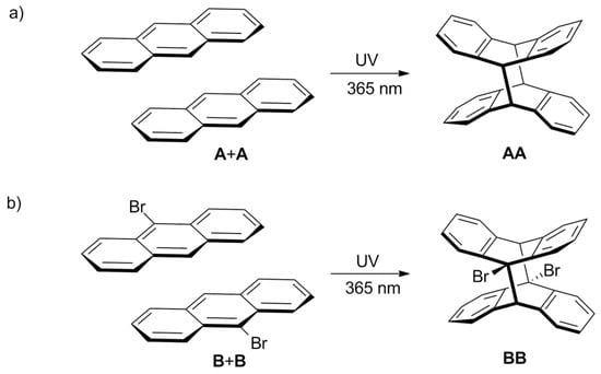 - Bouas-Laurent, H.; Castellan, A.; Desvergne, J.-P.; Lapouyade, R. Photodimerization of Anthracenes in Fluid Solutions: (Part 2) Mechanistic Aspects of the Photocycloaddition and of the Photochemical and Thermal Cleavage. Chem. Soc. Rev. 2001, 30, 248–263. [Google Scholar] [CrossRef]