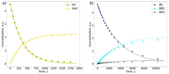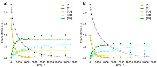 The analysis of mixture kinetics was more complex because most of the chemical shifts of AB protons were either in the same range as chemical shifts of AA and BB dimers, or too close to the solvent peak to be distinguishable. Two types of mixture with a molar ratio of A to B equal to 1:1.3 (Figure 8a) and 1:2.3 (Figure 8b) were investigated.