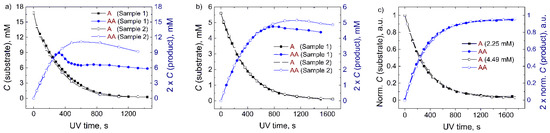 The effect of the precipitation on the photodimerization curves (λ = 365 nm) derived from 400 MHz 1H-NMR spectra of anthracene (A) and its dimer (AA). Each experiment was repeated on two separate samples (sample 1 and sample 2) prepared from the same batch. The precipitation was observed (a,b) until the concentration of anthracene was reduced to 4.5 mM, and no further effect of concentration on kinetics was noticed (c).