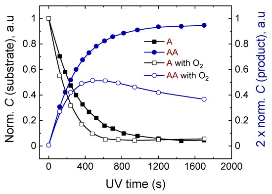 In order to obtain insights into the photokinetics of dimer formation, changes in the concentration of the substrate and the products during irradiation were analyzed. The NMR monitoring experiments were conducted at substrate concentrations equal to 4.5 mM. The reaction curves derived from 1H-NMR spectra are compared in Figure 2. Data were fitted using the following equations: