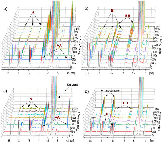 The 400 MHz 1H-NMR spectra of anthracene (A), dimer of anthracene (AA), 9-bromoanthracene (B) and dimer of 9-bromoanthracene (BB) in: (a,b) deoxygenated samples and (c,d) samples with oxygen at different reaction times, i.e., total time of UV illumination (λ = 365 nm).
