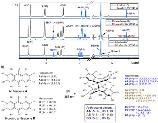 (a) The comparison of 400 MHz 1H-NMR spectra of 2.25 mM of pure anthracene (A) (at the top), 2.25 mM of pure 9-bromoanthracene (B) (at the bottom) and their mixture (in the middle) before (upper black spectrum) and after (lower blue spectrum) UV illumination (λ = 365 nm) as well as (b) the assignment of the spectral lines. S1–S5 and P1–P5 represent spectral lines of substrate and product respectively. AA, BB and AB correspond to the dimer of anthracene, dimer of 9-bromoanthracene and dimer of anthracene and 9-bromoanthracene, respectively. Samples were prepared in deuterated CD2Cl2 in the glove box.