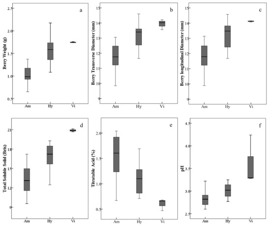 Ranges and distributions of weight (a), transverse diameter (b), longitudinal diameter (c), total soluble solid (d), titratable acid (e) and pH (f) of ripe berries belonging to different grape species/groups harvested in 2017 and 2018. The height of each box is equal to the interquartile range. The horizontal line in the interior of each box is the median. The whiskers extended from the top and bottom of each box with horizontal lines are the maximums and minimums, respectively. Abbreviations: Am, V. amurensis; Hy, hybrids of V. amurensis and V. vinifera; Vi, V. vinifera.