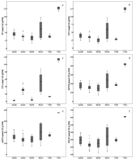 In this study, the antioxidant capacities (Figure 2d–f, Table S1), in vitro, were assayed by DPPH, ABTS and FRAP. For the seeds, the variation of the average antioxidant values among grape groups showed a similar tendency with respect to total contents of phenolics. The average values of antioxidant indicators were significantly lower in the V. amurensis grapes and hybrids than in the V. vinifera grapes. For the skins, the average level of antioxidant activities decreased in the order of Vi > Am > Hy, which differed from the distribution of total phenolic contents; but the difference of antioxidant values was not significant between V. vinifera and V. amurensis.