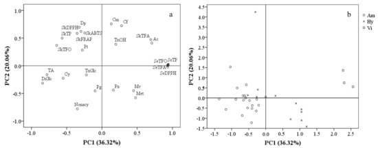 In order to separate these grape cultivars/accessions and describe the phenolic characteristics of different grape groups, a principal component analysis (PCA) was carried out on the basis of anthocyanin composition, total contents and the antioxidant activities of their phenolic compounds. A total of six principal components with eigenvalues >1 were obtained, explaining 91.69% of total variance. PC1 and PC2 possessed relatively high percentages of variance (36.32% and 20.06%, respectively). PC1 was mainly represented by total contents and antioxidant activities of seed phenolic compounds, skin TFA and the percentage of acetylated anthocyanins with positive correlations, as well as TA, TP, TFO and the percentages of diglucosides anthocyanins and Cy-derivativesin skins with negative correlations. PC2 consisted primarily of the antioxidant activities of the skins’ phenolics and the percentage of Dp-derivatives, coumaryl and caffeoyl anthocyanins with positive PC2 values, as well as nonacylated and methylated anthocyanins with negative PC2 values (Figure 5a).