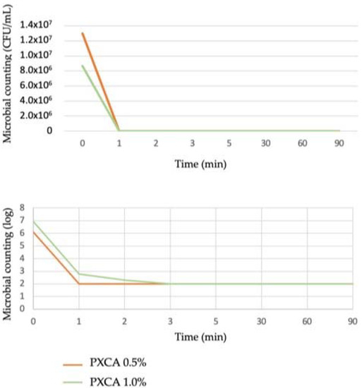 The time-kill test was performed according to the ASTM E2315-16 Standard Guide for Assessment of Antimicrobial Activity Using a Time Kill Procedure. The selected microorganism was prepared in a standardized manner and under ideal conditions. From the maintenance of the strain, a microorganism suspension at the desired concentration was prepared in tryptone salt solution. For the initial counting of the added inoculum, the surface seeding method was used. The time-kill assay was performed against C. acnes (ATCC 6919 and ATCC 11827) at contact times of 0, 1, 2, 3, 5, 30, 60 and 90 min. PXCA was tested at 0.5% and 1.0% (diluted in glycerin).