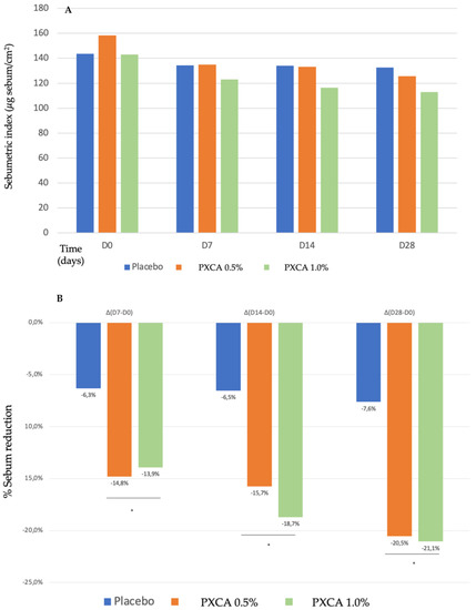 (A) Sebumetric index (µg/cm2) of the participants before the application of PXCA 0.5% (n = 15), 1.0% (n = 16) and placebo (n = 13) (D0) and after 7 (D7), 14 (D14) and 28 (D28) days of use. (B) Sebum reduction variation (%) for PXCA 0.5% (n = 15), 1.0% (n = 16) and placebo (n = 13) per period (D7-D0/D14-D0/D28-D0). * p < 0.05 in relation to the initial time (D0).