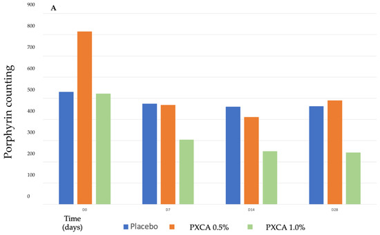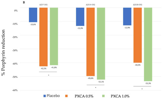 (A) Counts of the participants’ porphyrins before the application of PXCA 0.5% (n = 15), 1.0% (n = 16) and placebo (n = 13) (D0) and after 7 (D7), 14 (D14) and 28 (D28) days of use. (B) Reduction in porphyrin (%) for PXCA at 0.5% (n = 15), 1.0% (n = 16) and placebo (n = 13) per period of (D7-D0/D14-D0/D28-D0). * p < 0.05 in relation to the initial time (D0).