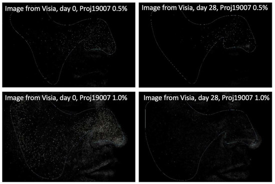 Images (Visia®) from two participants illustrating the reduction in inflammatory lesions after 28 days of treatment with PXCA 0.5% and 1.0%.