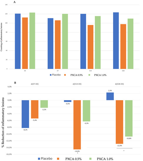 (A) Counts of the inflammatory lesions of the participants before the application of PXCA 0.5% (n = 15), 1.0% (n = 16) and placebo (n = 13) (D0) and after 7 (D7), 14 (D14) and 28 (D28) days of use. (B) Reduction in inflammatory lesions (%) for PXCA at 0.5% (n = 15), 1.0% (n = 16) and placebo (n = 13) per period of (D7-D0/D14-D0/D28-D0). * p < 0.05 in relation to the initial time (D0).