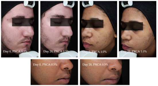 Photographs from three participants illustrating the improvement in the skin aspect/appearance after 28 days of treatment with PXCA 0.5% or 1.0%.