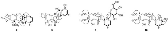 1H-1H COSY (―) and key HMBC (→) correlations of 2, 3, 9, and 10.