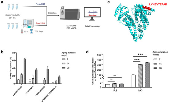 We artificially deamidated HSA by incubating the protein in Tris buffer at pH 8.5 and 60 °C for 0, 7, 14, and 28 days. After digesting the artificially aged and totally fresh HSA (aHSA and fHSA, respectively) by a mix of the enzymes Lys-C and trypsin, we desalted the peptides and analyzed them by LC-MS/MS with electron transfer dissociation (ETD), which provides an isoAsp-specific fragment [32]. Then we identified the isoAsp-containing peptides, quantified the peptide abundances by our home-made software Quanti [33] and calculated the isoAsp occupancy in the Asn-containing peptides as a function of ageing duration (Figure 1a).