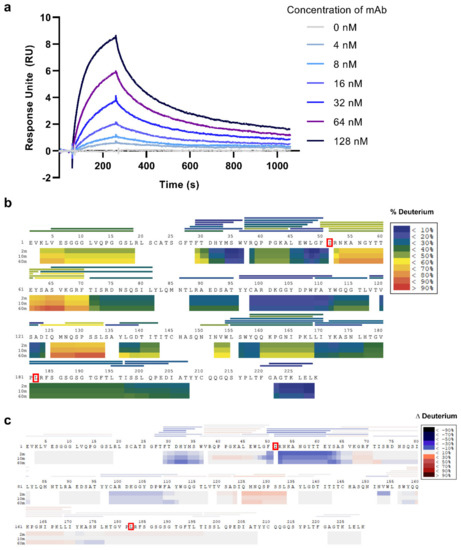 Characterization of binding interface between 1A3 mAb and aHSA. (a) The sensorgram of mAb/aHSA interaction at different mAb concentrations. (b) The coverage of the 1A3 sequence by reporter peptic fragments (horizontal lines) in HDX MS analysis and the background deuterium incorporation (horizontal bars). (c) The differential deuterium incorporation between the mAb/aHSA complex and the mAb alone. Negative values (in blue) represent protection/stabilization while positive values (in red) indicate destabilization.