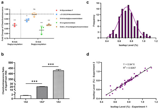 The application of 1A3 mAb in indirect ELISA for determination of isoAsp in blood HSA. (a) The changes in 1A3 specificity to aHSA after deglycosylation by five different galactosidases; * p < 0.05; ** p < 0.01; ns: not significant. (b) The comparison of mAbs specificity to aHSA versus fHSA for 1A2, 1A3* and 1A3 mAb, where 1A3* has the same variable region sequences as 1A3 but of a different IgG isotype (IgG2b compared to IgG3); *** p < 0.0001 (c) The distribution of isoAsp occupancies in HSA measured in 100 blood plasma samples from healthy individuals, obtained using linear calibration. (d) Comparison between the ELISA results of 50 blood plasma samples measured using 1A3 antibody with a two-week interval.