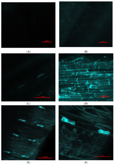 Engineered nanoparticles can penetrate plant root cells by different mechanisms, such as through aquaporins, membrane transport proteins, endocytosis, or creating new pores [41,42]. Our experiment with purchased fluorescent Fe3O4 NPs that were 25 nm in diameter (this was the smallest size available for purchase due to the pandemic) showed penetration into barley roots and translocation to leaves (Figure 2). Moreover, there was a difference in fluorescence intensity between leaves exposed to NPs for 1 (Figure 2C,D) and 6 days (Figure 2E–H); longer treatment with NPs showed greater fluorescence in leaves in comparison to 1-day treatment. Fluorescence in control roots and leaves was not detected.