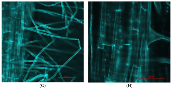 Examples of confocal laser scanning images of barley seedling leaves (A,C,E,F) and roots (B,D,G,H) treated hydroponically with Fe3O4 NPs. (A)—control seedling leaves (magnification 200×); (B)—control seedling root (magnification 200×); (C)—presence of fluorescent Fe3O4 NPs in seedling leaves after 1-day treatment (magnification 200×); (D)—presence of fluorescent Fe3O4 NPs in seedling roots after 1-day treatment (magnification 200×); (E)—presence of fluorescent Fe3O4 NPs in seedling leaves after 6-day treatment (magnification 200×); (F)—presence of fluorescent Fe3O4 NPs in seedling leaves after 6-day treatment (magnification 600×); (G)—presence of fluorescent Fe3O4 NPs in seedling roots after 6-day treatment (magnification 200×); (H)—presence of fluorescent Fe3O4 NPs aggregates (rows) in seedling roots after 6-day treatment (magnification 600×).
