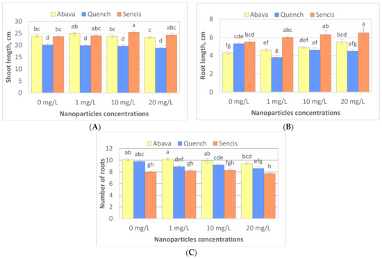 Shoot length (A), root length (B), number of seminal roots (C) expressed as the % of control, in H. vulgare L. cultivars seedlings grown 8 days with 1, 10, and 20 mg/L of Fe3O4 NPs. Values are the mean of three replicates with SD. Different letters within each bar indicate significant differences at p < 0.05 and the same letters indicate no significant difference (Tukey’s test—two-way analysis of variance).