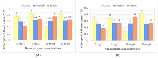 Chlorophyll (Chl) is an important photosynthetic pigment in plants that participates in photosynthesis and thus plant growth [61]. Chl content is a key parameter for many plant biological studies [62]. To identify the effects of the Fe3O4 NPs on the barley seedling Chl level, Chl quality (fluorescence, ×106) and quantity (content of chlorophyll, mg/g) were determined. All tested concentrations significantly affected Chl fluorescence (Figure 4A,B), especially in the case of ‘Sencis’. Fe3O4 NPs increased the Chl a and b fluorescence levels to more than 0.04 to 0.3 × 106 compared to control samples. ‘Quench’ seedlings had increased levels (0.61 to 0.63 × 106) depending on the nanoparticle concentration. The 20 mg/L NP dose was optimal for increasing Chl a and b fluorescence to 0.84 and 0.42 × 106, respectively, in treated ‘Abava’ plants in comparison to the control (0.77 and 0.32 × 106, respectively). The content of Chl a and b in comparison to the control was higher after application of 10 and 20 mg/L Fe3O4 NPs (Figure 4C,D). Total Chl concentration increased in all treated cultivars (Figure 4E). The highest increasing of total Chl concentration was observed in ‘Quench’ seedlings, above 12.22 to 32.1 mg/g in comparison to control. However, the lowest increasing was observed in ‘Abava’ seedlings, above 2.49 to 9.91 mg/g compared to control samples. Moreover, it was observed that Chl content was inversely related to the Fe3O4 NPs concentrations, there was an observed decrease in total Chl concentration (in three different barley cultivars) with increasing NP concentrations from 1 to 20 mg/L. Previously, significant mean Chl fluorescence increases were detected in yellow medick seedlings treated with Fe3O4 NPs at 1, 2, and 4 mg/L [12].