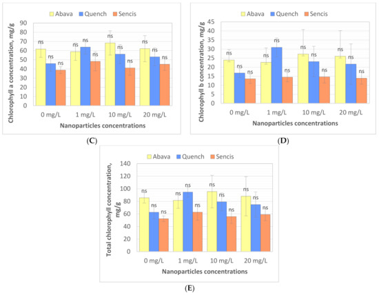 Effects of different Fe3O4 nanoparticle concentrations on chlorophyll a, and b fluorescence (×106) (A,B), content (mg/g) (C,D), and total chlorophyll concentration (mg/g) (E) in treated three H. vulgare L. seedlings expressed as the % of control. Values are the mean of three replicates with SD. Different letters within each bar indicate significant differences at p < 0.05 and the same letters or ‘ns’ indicate no significant difference (Tukey’s test—two-way analysis of variance).