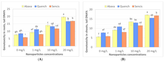 The comet assay is widely used to study the genotoxicity of various NPs in plants. Comet assay results are most often expressed as % tail DNA [70,71]. To the best of our knowledge, there are a limited number of studies performed on genotoxicity evaluation of Fe3O4 NPs in plants. Compared to the control, Fe3O4 NP treatments (1, 10, and 20 mg/L) significantly increased DNA damage (Figure 5A,B) in roots and shoots, particularly after treatment with a higher concentration of nanoparticles. In general, higher genotoxicity was observed in roots of both treated and control seedlings. Genotoxicity level increased with increasing of Fe3O4 NP concentrations. ‘Quench’ seedlings were the least sensitive to changes in DNA compared to the other two cultivars, there was observed about 7.8% higher genotoxicity at 20 mg/L compared with control samples. Genotoxicity level increased above 11.6% and 11.9% in ‘Abava’ seedlings’ shoots and roots, respectively, and above 11% in both ‘Sencis’ seedlings’ shoots and roots.