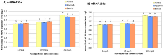 In a Latvian barley variety treated with Fe3O4 NPs at 35 and 70 mg/L, a significant increase in miR156a expression was detected (1.96- and 3.75-fold, respectively) [53]. Additionally, there was a significant increase in miR159c expression in yellow medick after a 5-week exposure to small Fe3O4 NPs (1, 2, and 4 mg/L) [12]. The obtained results of another experiment with garden rocket also showed a slight increase in miR159c expression level [58]. The expression level of miR156 in pineapple plants exposed to MgO NPs at 1–4 g/mL was increased. However, miR159 expression was downregulated in the same plants [77]. Tabatabaee et al. (2021) [36] reported that Cu NPs at concentrations above 100 mg/L significantly increased the expression of miR159 in pepper seedlings.