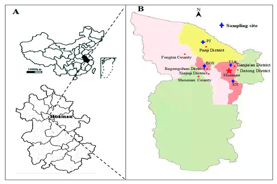 Huainan is located in east of China and north central of Anhui, which consists of five districts and two counties with a population of 3.0 × 106 and covers 5533 km2. Huainan is the energy capital of China, the industrial granary of East China and an important industrial city in Anhui Province. Wet sludge samples after dehydration were collected from municipal sewage treatment plants in different locations in the urban area of Huainan City (Figure 1): TJA (Tianjiaan), SN (Shannan), PJ (Panji), and BGS (Bagongshan). The details of these plants are indicated in Table 1. After mixing evenly, the samples were sealed in a polyethylene bag under freezing conditions and brought to the laboratory as soon as possible. The samples were air-dried at room temperature, the impurities were removed, the samples were sampled by the quartering method, grinded through a 100-mesh sieve, sealed, and stored in a drying oven for testing.