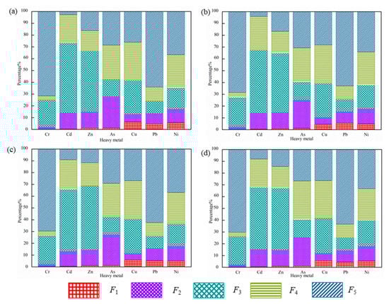 Among the five fractionations of heavy metals, the residual fraction is a relatively stable phase that is difficult to migrate and transform under general conditions. It is considered that there is no risk of pollution to the environment under natural conditions, and the toxicity is the smallest. The acid exchangeable phase (F1), oxidizable phase (F2), and reducible phase (F3) are extractable phases and can be released under certain environmental conditions, absorbed by organisms, indicating the high mobility of heavy metals and have potential harm [14,17]. Various geochemical fractions of different heavy metals in the sludge are depicted in Figure 2. The morphological distribution of heavy metals in the sludge of the Huainan municipal sewage treatment plant is clearly different due to the different types of heavy metals. The mean contents of heavy metals in different fractions followed the orders: