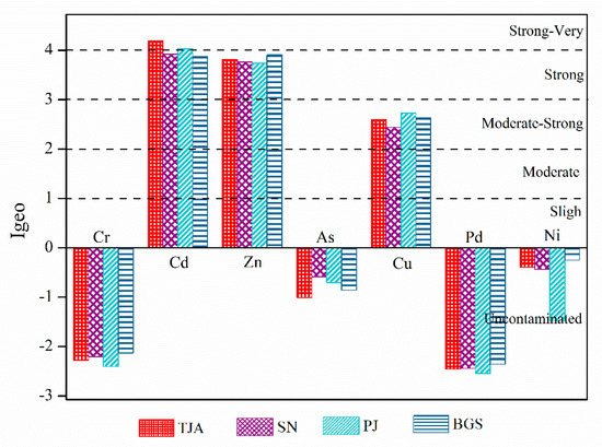 The Igeo results for the heavy metals in the sludge. TJA (Tianjiaan), SN (Shannan), PJ (Panji), and BGS (Bagongshan).