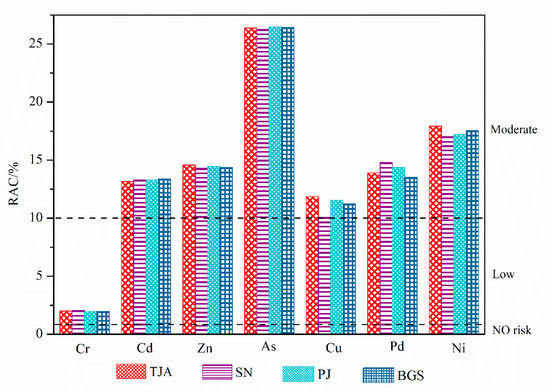 Heavy metals in sludge are bound to different fractions with different strengths in changes of mobility and availability. The RAC is mainly used to evaluate the mobility and availability of the exchangeable/acid-soluble fraction-bound metals. The results of the RAC index are reported in Figure 4. Among the sludge samples from four municipal sewage treatment plants, the average values of RAC of seven heavy metals are As (26.38%) > Ni (17.42%) > Zn (14.42%) > Pb (14.14%) > Cd (13.28%) > Cu (11.18%) > Cr (1.99%), which also represents the order of effectiveness and environmental risk of seven heavy metals to a certain extent. The risk level of Cr in sludge is low risk, and that of other heavy metals is moderate risk.