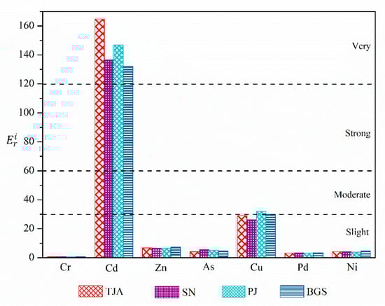 The potential ecological risk assessment method, proposed by Hakanson [33], quantitatively divides the potential ecological hazard degree by measuring and analyzing the pollutant content in the sample, which can reflect the comprehensive impact of various heavy metals on the ecological environment, and has been proven to be a relatively fast, simple, and standard method for dividing the pollution degree of heavy metals and potential ecological risks. It is widely used in the ecological risk assessment of heavy metals in sediment, soil, and sludge. It is determined using the following formulas: