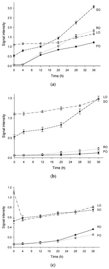The EPR measurements of four fresh oils were carefully performed under the temperature of 120 °C (Figure 1c). The signal intensity of the EPR spectrum, was taken as an important parameter to indicate the amounts of free radicals. The highest signal intensity was observed in the LO sample, followed by SO and RO, while the lowest was found in PO. In general, the signals increased during the entire period. In the first 10 min, the total spin adducts in SO and LO increased rapidly and then slowed down in the last 10 min, while the signals in PO and RO show low initial increased rates. It can be predicted that the signal intensities of LO and SO reached a plateau after 30 min, while the PO and RO signals showed a steady increase. These opposite trends showed the difference in the oxidative stability of the four oils. The magnitude of the signal in each oil sample was mainly attributed to the double bonds of the unsaturated fatty acids, indicating the stability against oxidation. Accordingly, PO was mainly composed of oleic acid (33.56%) and palmitic acid (29.29%), while RO, SO, and LO mainly consisted of oleic acid (46.29%), linoleic acid (51.87%), and linolenic acid (41.02%), respectively. In the study by Symoniuk et al., this feature was known as the oxidizability value, which could be calculated using the fatty acid profile [31]. Based on the EPR signals, the thermal-oxidative stability of the four oils was in the order of PO > RO > SO > LO, corresponding to the initial OSI results in Table 1. For instance, in the absence of the antioxidants, the oxidative stability of PO can only be attributed to the highest amount of saturated fatty acids. Meanwhile, the free radical signals in PO showed a relatively lower increase rate. Therefore, in 30 min of heating, the trends of the signal intensities in the four oils showed significant differences, which can also explain the different degradation behavior of the four heated vegetable oils.