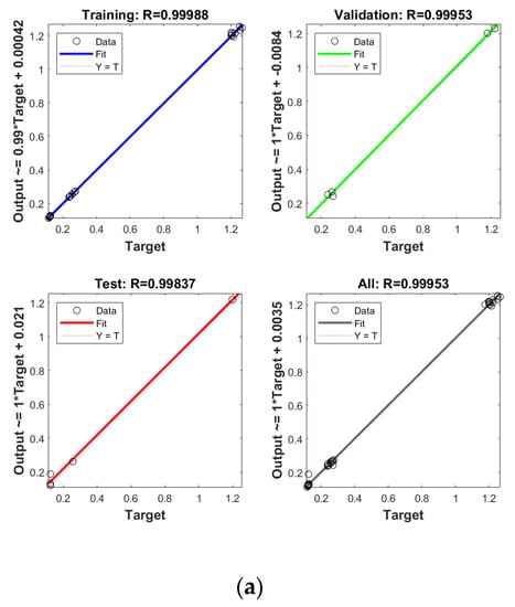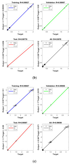 In order to establish the prediction models for the free radical change of thermal oxidized oils, the chemical data (AV, p-AV), main unsaturated fatty acids (C18:1, C18:2, C18:3), and typical volatile indicators for oil oxidation were selected as the input layer neurons and the free radical level of vegetable oils was used as the output layer neuron. The parameters were randomly divided as training set, validation set, and testing set with the proportion of 70%, 15%, and 15%, respectively. The Levenberg–Marquardt and gradient descent momentum learning function were selected as the training algorithm. The model tuning was achieved based on the number of neurons in the hidden layer. The number of neurons in the hidden layer was adjusted continuously through the test of practical training. When the number of neurons in the hidden layer of ANN was 10, the comprehensive comparison results of R and MSE between the training set and the test set was the best. Moreover, cross-validation on model training was included in the ANN model, analyzed using MATLAB R2018b. ANN has been successfully applied in food to assess aspects of a kinetic model, physicochemical properties, and to support quality analysis and intelligent control design. Deep learning such as ANN has higher recognition accuracy on large sample data sets compared to traditional machine learning [43]. As listed in Figure 4, the predicted values of different oil samples obtained by the ANN method were in high correlation with the measured values, and the R values of the training set were above 0.99. The accuracy and stability of the prediction model was also verified by the results of the high R of validation set with the values of 0.99, 0.99, 0.99, and 0.99 for PO, RO, SO, and LO, respectively, indicating the good prediction ability of these models. Table 4 shows the mean square error (MSE) and coefficient of determination (R2) of the different free radical prediction models for evaluating the performance of fitting and predicting. It can be seen in Table 4 that the R2 values of different free radical models were all above 0.97 (the high R2 corresponding to low MSE) and no significant difference was found between predictive values and true values among methods (p > 0.05), and the small predicted and measured values were observed, which indicated that ANN could be used as accurate prediction model for free radical of vegetable oils during thermal oxidation. This is the first time that the ANN was applied to predict the free radicals of vegetable oils. Previous studies on the free radicals in fats and oils were usually determined by EPR, and results showed that the amount of formed free radicals in oxidized fats and oils increased with the increase of oxidized time [34,44], in agreement with our results. The application of ANN in food focuses on the kinetic model, physicochemical properties, quality analysis, and intelligent control design [24]. Sun et al. (2019) used ANN to establish a predictive model for flavor changes in ginger during the drying process, and results showed the model fitted well and a smaller mean square error was observed between the true value and predicted values [27]. The correlation between the free radical and input layer neurons of ANN in oils is shown in Table 5. It should be noted that there was a significant correlation between the free radical amount and input layer neurons of ANN in SO (correlation coefficients were above 0.9). As to LO, the free radical had a high correlation with input layer neurons of ANN except for Ald16 ((E,E)-2,4-decadienal). The free radical was only highly correlated with Ald15 (2-undecenal) and Ald16((E,E)-2,4-decadienal) in PO. As shown in Table 4, free radical in RO was relatively correlated with AV, C18:3, and Ald16 ((E,E)-2,4-decadienal). The same data were analyzed by a linear regression model (LRM), and results showed that the R2 of LRM model applied in PO, RO, SO, and LO was 0.9634, 0.9564, 0.9521, and 0.9462, respectively, which were lower than those of ANN models. The comparison between ANN and LRM indicated that ANN had higher recognition accuracy on data sets compared to the traditional machine learning methods such as LRM. Table 6 shows the values of two factors which were used for quantifying the uncertainty of results. As indicated, the values of p-factor for four ANN models were satisfactory and the predicted lake levels were enclosed by the 95% prediction interval, and the values of d-factor were all less than 1, which indicated that the four ANN models had less uncertainty.
