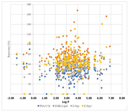 For pesticides possessing a Log P < 2, the recoveries were below 60% for most of these pesticides when PSA/C18 and Z-Sep were used, confirming the strong polar interactions between the sorbent and polar analytes. These results were consistent with the polar surface of amino groups (PSA) and zirconium dioxide (Lewis acid). By contrast, the recoveries obtained using Z-Sep+ sorbent for the same kind of pesticide were higher due to the presence of octadecylsilane chains, which limited the accessibility of the zirconium dioxide surface.