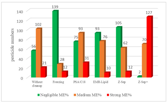 For rapeseed extract purified with EMR-Lipids, more than 90 molecules had a negligible matrix effect, and more than 70 pesticides had a medium matrix effect; these results confirm the efficiency of purification with the EMR-Lipid sorbent. The freezing process allowed us to significantly eliminate the matrix effect. Therefore, a combination of freezing followed by EMR-Lipid should be very efficient in limiting matrix effects. Moreover, the worst ME% values were obtained on the extracts of rapeseed purified with Z-Sep+, with more than 120 strong matrix effects. These purification materials appeared to be unsuitable for this specific matrix.