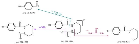 Compound 1 was isolated as a light yellowish solid, and was positive for Dragendorff reagent. Its molecular formula was established as C12H18N4O2 from a pseudmolecular ion peak at m/z 251.1514 [M+H]+ (calcd for C12H19N4O2, 251.1508) in the HR-ESI-MS (Figure S1), indicating that the molecule has six degrees of unsaturation. Based on the representative MS+2 spectrum (Figure S2) of compound 1, the proposed fragmentation pathways of compound 1 are shown in Figure 2. As a result, the fragmentation of the molecular ion of compound 1 at m/z 251.1514 led to the predominant product ion at m/z 121.0293, arising from cleavage of the amide linkage. The ion at m/z 234.1232 could be produced by loss of an ammonia molecular. In addition, the ion at m/z 192.1035 could be derived from terminal loss of the neutral guanidine molecule.