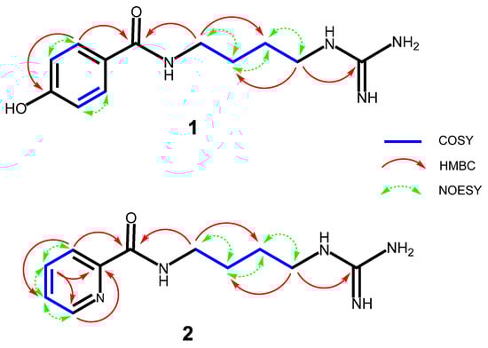 In accordance with the molecular formula, 12 carbon signals were resolved in 13C NMR spectra (Figure S4) of 1, with aid of the DEPT (Figure S5) and HSQC (Figure S7) experiments, assignable to four sp3 methylenes, four protonated sp2 carbons, and four non-protonated sp2 carbons, where the downfield signal at δ 170.4 was assigned to carbonyl carbon. The 1H NMR spectrum (Figure S3) of 1 revealed resonances of a typical AA′XX′ spin system at δH 7.71 (H-2/6) and 6.87 (H-3/5), attributable to a 1,4-disubstituted phenyl moiety, and combination analyses of the typical chemical shift of the quaternary carbon at δC 161.2 (C-4) demonstrated that position C-4 was substituted by a hydroxyl group. The HMBC (Figure S8) correlations from H-2,6 (δH 7.71) to C-7 (δC 170.4) and from H-2,6 (δH 7.71) to C-4 (δC 161.2) confirmed the presence of a p-hydroxylbenzoyl substructure (Figure 3). Moreover, its 1H-NMR spectrum also exhibited the characteristic signals for a n-butyl unit (δH 3.38 (2H, t, J = 6.2 Hz, H-1′), 1.65 (2H, m, H-2′), 1.64 (2H, m, H-3′), 3.22 (2H, t, J = 6.2 Hz, H-4′)), which was further confirmed by successive 1H-1H COSY (Figure S6) connections from 1′-CH2 (δH 3.38) to 4′-CH2 (δH 3.22) (Figure 3). The methylene protons at δH 3.22 and δH 3.38 appeared as low field values due to the adjacent nitrogen atoms. The remaining elements comprised one specific quaternary carbon (δC 158.2) [20] and three nitrogen atoms representing a guanidine group. The HMBC correlation between δH 3.38 (H-1′) and δc 170.4 (C-7) was observed, indicating that the n-1,4-butyldiamine chain was directly attached to the carbonyl carbon at C-7; the HMBC correlation from H-4′ (δH 3.22, t, J = 6.2 Hz) to C-5′ (δC 158.2) confirmed that C-4′ (δc 42.1) of the n-1,4-butyldiamine chain was directly attached to the guanidine group (Figure 3). On the base of further analyses of its DEPT, 1H–1H COSY, HSQC, HMBC and NOESY (Figure S9) spectra, compound 1 was identified as N-(4-guanidinobutyl)-4-hydroxybenzamide (Figure 1) and was given the trivial name Buthutin A. Although it was previously reported in a synthetic study [21], this is the first report of its occurrence in nature.