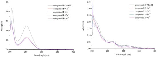 The ability of the synthesized compounds in binding metals would be an added advantage in the treatment of AD. Herein, compounds 1–4 were studied for their binding abilities toward Cu2+, Fe2+, Zn2+ and Al3+, using UV spectrophotometer with wavelengths ranging from 200 nm to 400 nm. As shown in Figure 6, the spectra of compounds 1 and 3 were significantly changed upon the addition of CuCl2, FeCl2, ZnCl2 and AlCl3. The dramatic decreases in absorbance indicated the possible interactions between these biometals and compounds 1 and 3. The potent metal binding ability of compounds 1 and 3 could be due to the contribution of hydroxyl group and the donation of carboxyl anion, respectively.