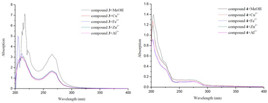 UV spectra of compounds 1–4 alone or in the presence of CuCl2, FeCl2, ZnCl2 or AlCl3.