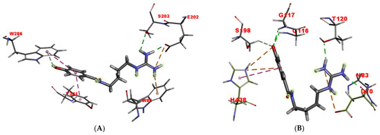 The interaction of compound 1 with BChE was also carried out. As seen in Figure 7B, compound 1 was bound to the residues Gly117 and Gly116 from the oxyanion hole (OAH), Ser198 and His438 from CAS, Asp70 from PAS, and additionally to Thr120 and Asn83 residues, via two charge interactions, one π–cation interaction, one π–π T-shaped interaction, four conventional hydrogen bonds, and one carbon hydrogen bond. Compared to its extended conformation bound to AChE, compound 1 exhibited a somewhat U-shaped conformation, which might partly explain its lower inhibitory potency.