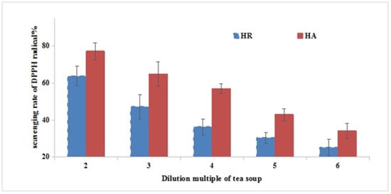 Scavenging rates of Congou black tea processed by hot air (HA) and hot roller (HR) treatments at various concentrations on DPPH free radicals.