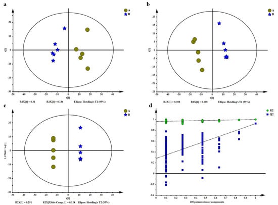 (a) Score plots from principal component analysis. (b) Partial least squares discrimination analysis. (c) Orthogonal partial least squares discrimination analysis. (d) Its permutations test. The dataset comprised 966 filtered ion features. Stars in blue show samples from the HR treatment group, spots in yellow indicate the samples from the HA treatment group, Stars in blue show samples from the HR treatment group, spots in yellow indicate samples from the HA treatment group.