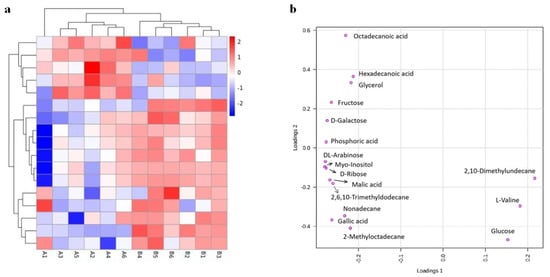 (a) Heat map of metabolites in tea samples dried by the HA and HR treatments. Group A, Yihong Congou black tea processed by HA drying; Group B, Yihong Congou black tea processed by HR drying. Warm color and cold color indicate increased and decreased expression of the metabolites, respectively. (b) Loading plot of metabolites in tea samples dried by the HA and HR treatments, based on the criteria of VIP > 1, p < 0.05, and match score ≥ 700. D-ribose and gallic acid were considered as the most influential characteristic metabolites.