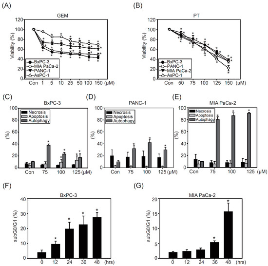 Next, we investigated the relative mechanisms regarding autophagy and survival components after PT treatment. As shown in Figure 1C, PT treatment for 48 h induced apoptosis (15–20%) and autophagy (20–40%), but no necrosis, in BxPC-3 cells (Figure 1C). Furthermore, PANC-1 (Figure 1D) and MIA PaCa-2 cells showed significantly increased autophagy, which was higher in MIA-PaCa-2 cells than others (approximately 80%), after PT treatment (Figure 1E). Time-course-dependent studies also confirmed that PT induced a significant increase in subG0/G1 (30%) in BxPC-3 cells compared to MIA PaCa-2 cells (15%), confirming that PT induced significant cell death in BxPC-3 cells, while MIA PaCa-2 cells were more resistant to PT treatment (Figure 1F,G).