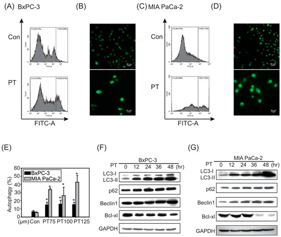 Because autophagy has been shown to contribute to chemoresistance in PDAC cells [14], we next investigated the autophagy levels in BxPC-3 and MIA PaCa-2 cells after PT treatment for 24 h. PT treatment caused the induction of autophagy in both PDAC cell types, as indicated by flow cytometry (Figure 2A,C) and immunofluorescence staining (Figure 2B,D). The results of Western blot analysis further showed a time-dependent induction of LC3-II and Beclin1 in both cell lines after PT treatment (Figure 2F,G). We also observed significantly reduced expression levels of Bcl-xl in PDAC cells in response to PT treatment.